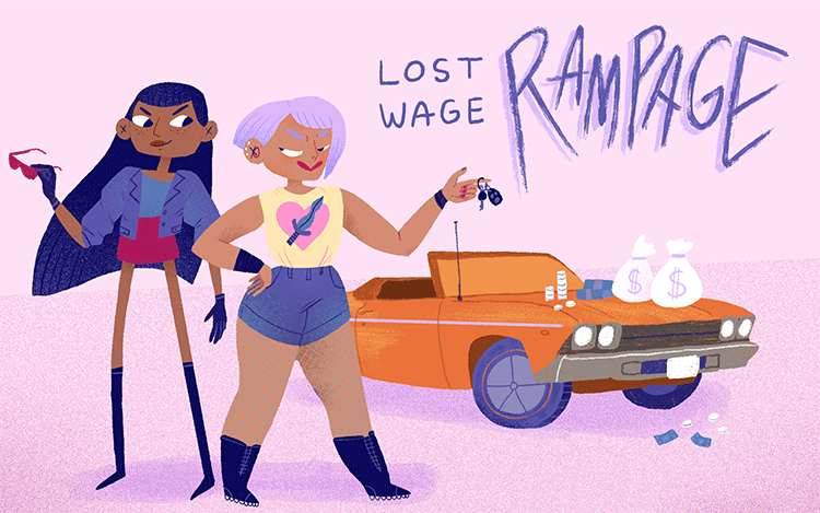 Lost Wage Rampage is a fast-paced riot grrrl driving game: Grand Theft Auto crossed with Thelma & Louise. The goal is to steal as many valuable objects from the mall as possible, in order to get the money that should have been the girls’ in the first place. Drift, skid, and rocket your car through the mall, crashing into and collecting valuable loot to add to their payback. Get your score as close as you can to the money they should have made while navigating infinite and constantly changing mall layouts. And look out: an ever-growing presence of mall cops is intent on stopping your heist.